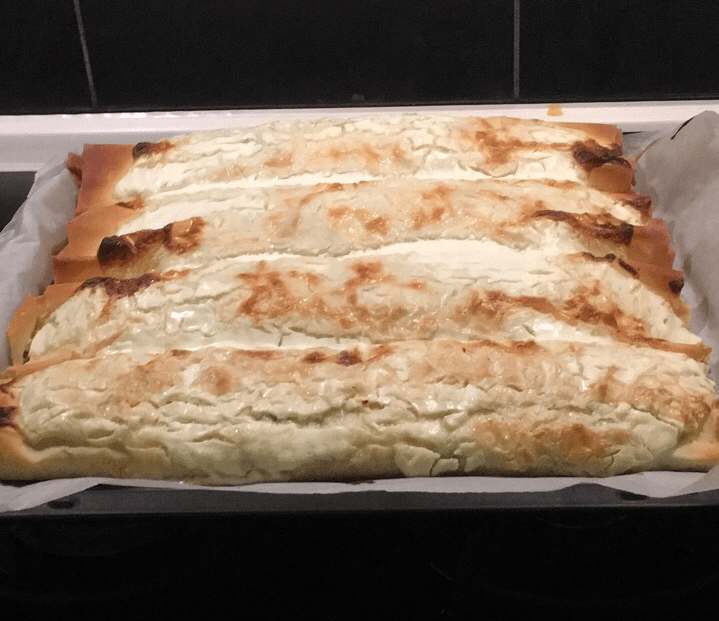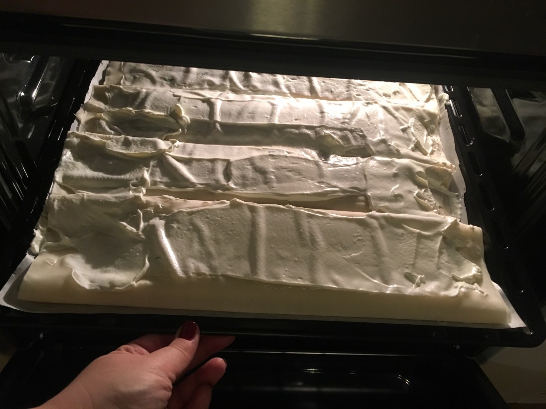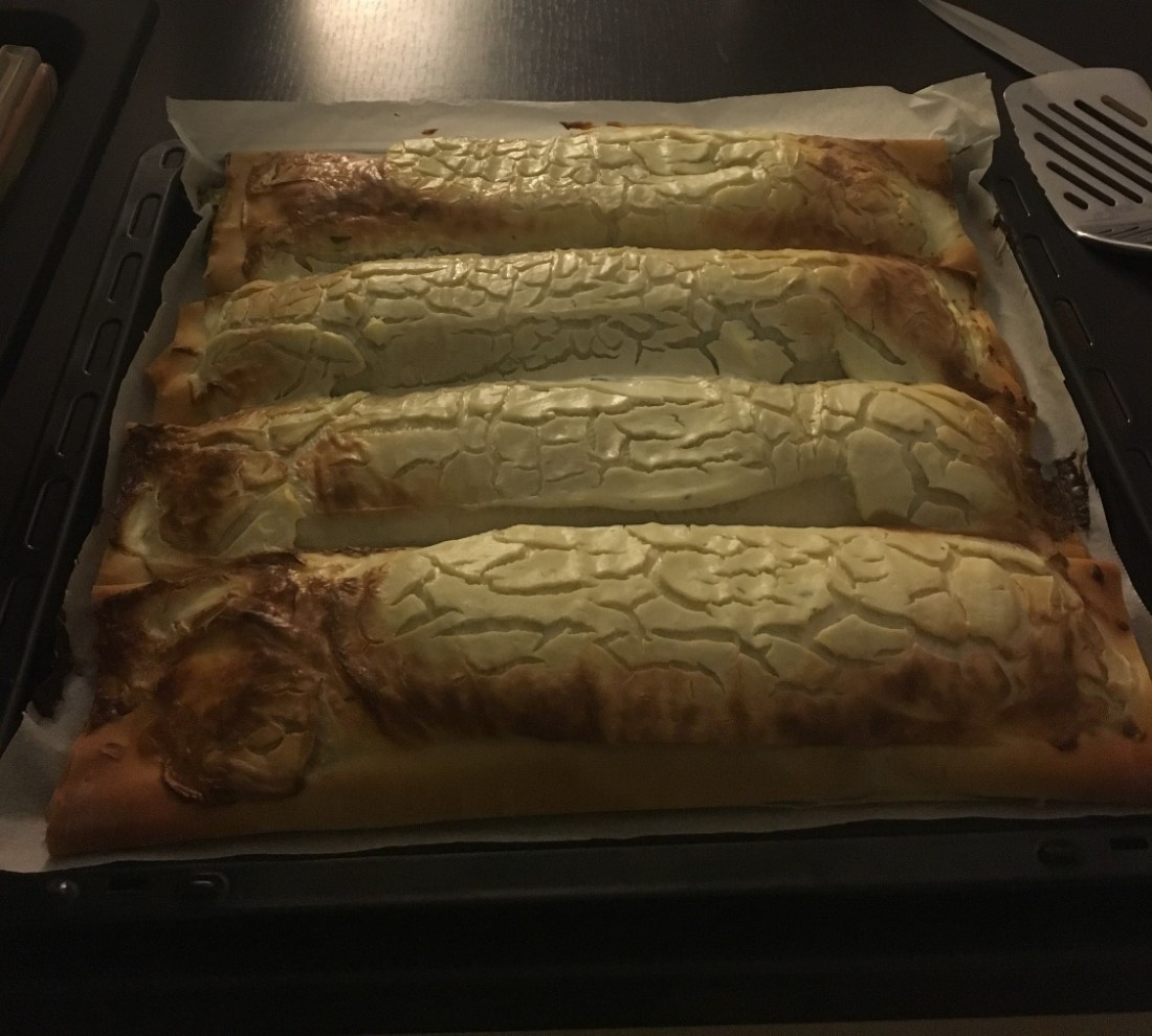 Za kraj, pomiješajte preostalo vrhnje (100-150 grama) s malo vrhnja za kuhanje ili s plavim kiselim vrhnjem i dobro premažite sve štrudle/cijelu pitu. Stavite ju peći na sredinu pećnice i provjerite je nakon pola sata. Ona je sada već gotova, ali ako se nije dovoljno zapekla, slobodno pojačajte pećnicu na 200 stupnjeva i pustite još 10 minuta. Nakon toga ju izvadite i ostavite da se hladi. Jedan od razloga je da se lakše reže, a drugi je da od gladi ne spalite grlo kao ja 😀