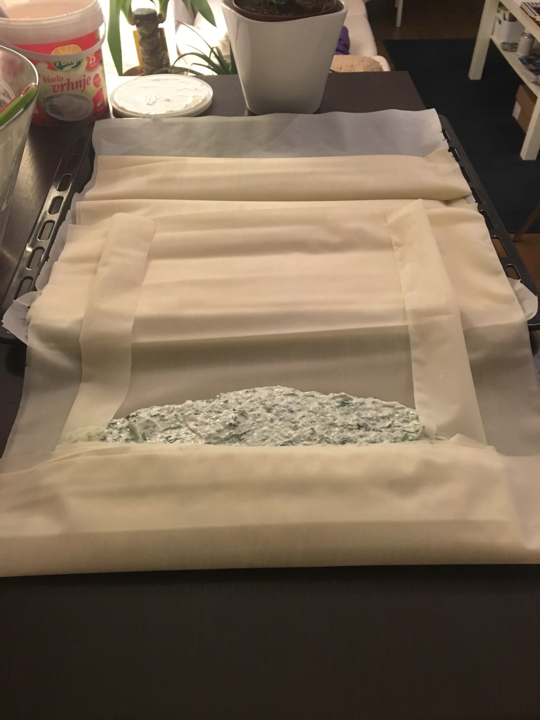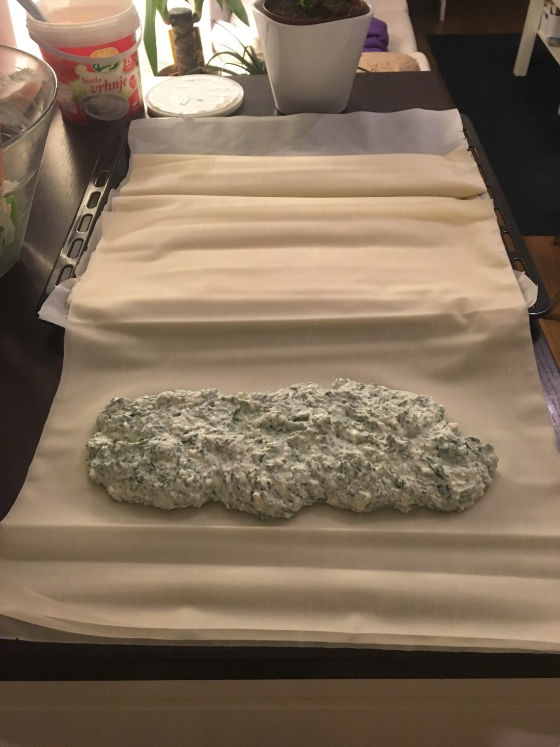 Za pripremu svake role štrudle uzmite 3 kore. Dodajte smjesu bliže donjem rubu. Zatim jednu koru savinite tako da štiti smjesu da ne curi van (vidi fotografije). Sve skupa odozdo krenite rolati prema gore, sve dok ne dođete do kraja. Primite za krajeve koji nisu namazani tijestom i okrenite rolicu 🙂