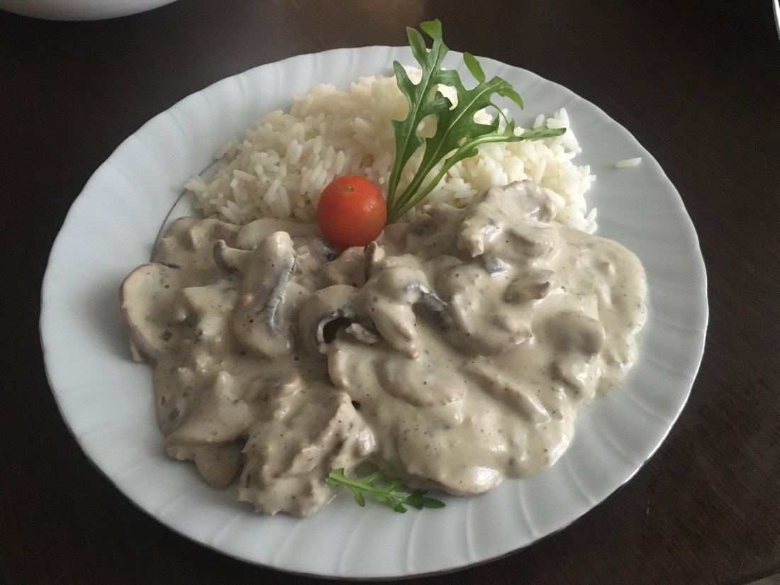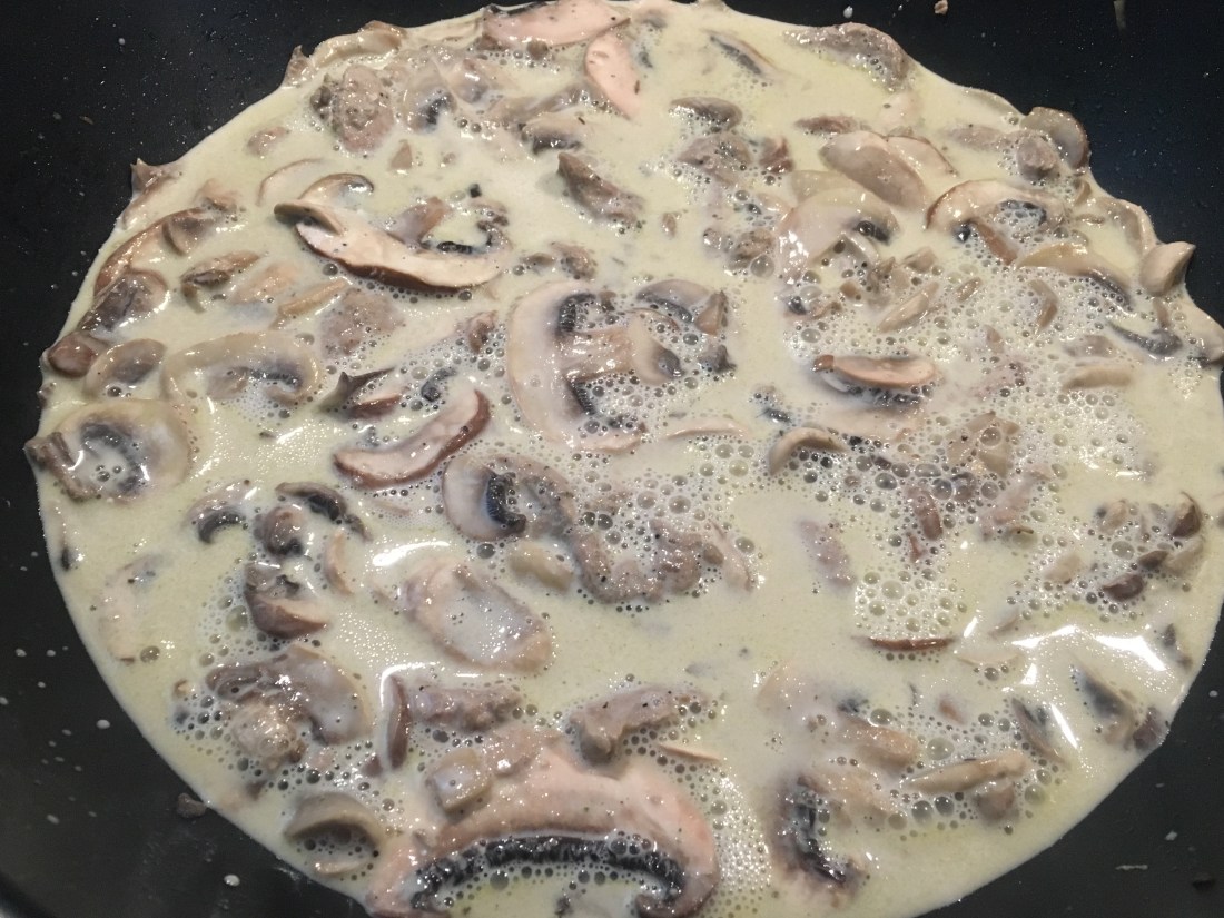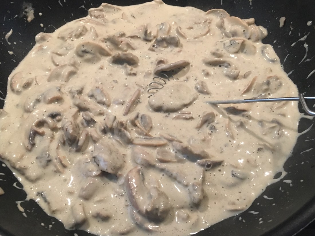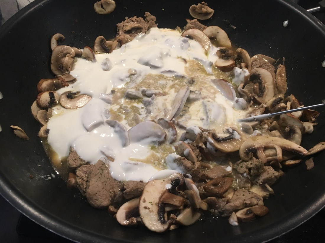 U velikoj šalici pomiješajte kiselo vrhnje i vrhnje za kuhanje. Kad ste to dobro promiješali, izlijte vrhnja u tavu i sve dobro izmiješajte sa saftom, mesom i gljivama. Smanjite vatru i kuhajte otklopljeno dok ne zakipi.