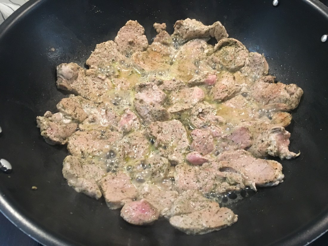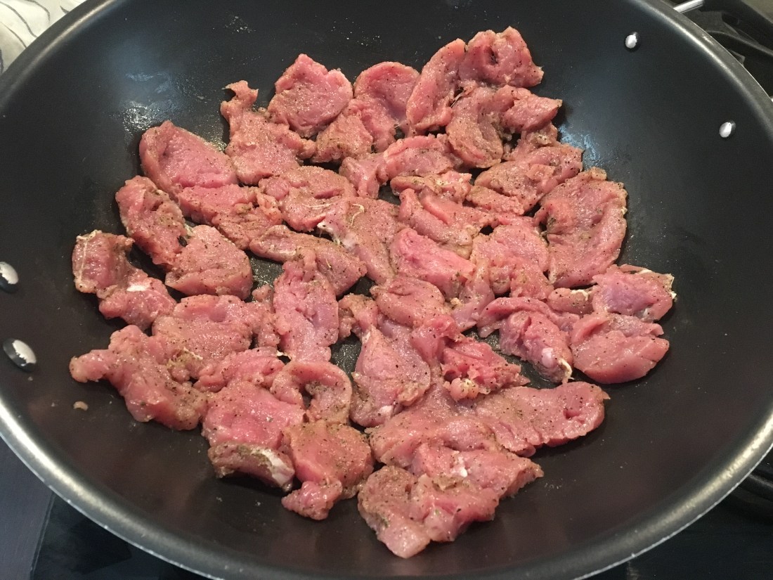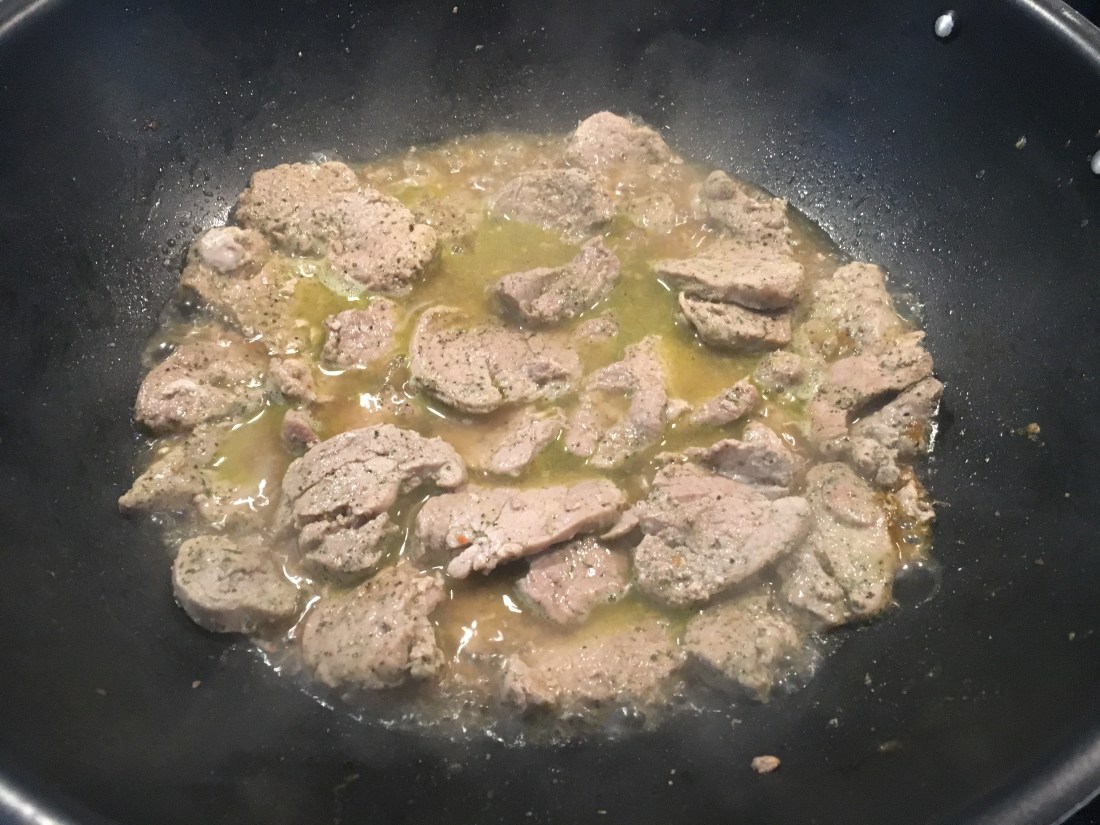 Očistite lungić od masnoće i narežite ga na šnite do 0,5 cm debljine. Važno je da budu podjednake debljine kako bi meso u isto vrijeme bilo gotovo. Zagrijte wok tavu, u nju stavite žlicu maslinovog ulja i meso. Začinite ga samo žličicom punom zelenog papra s češnjakom i sve dobro promiješajte.