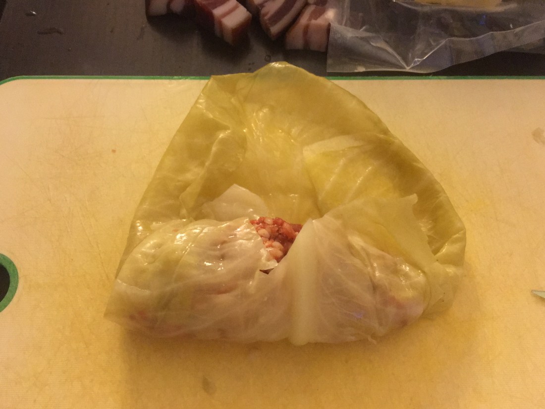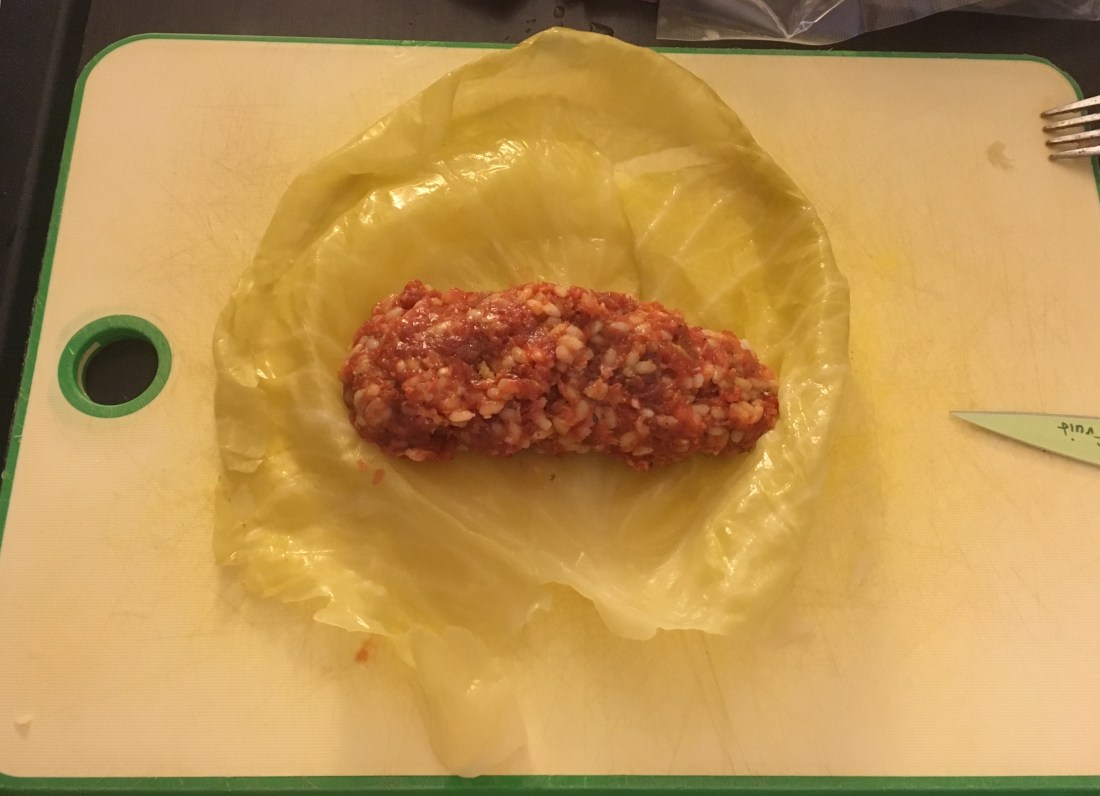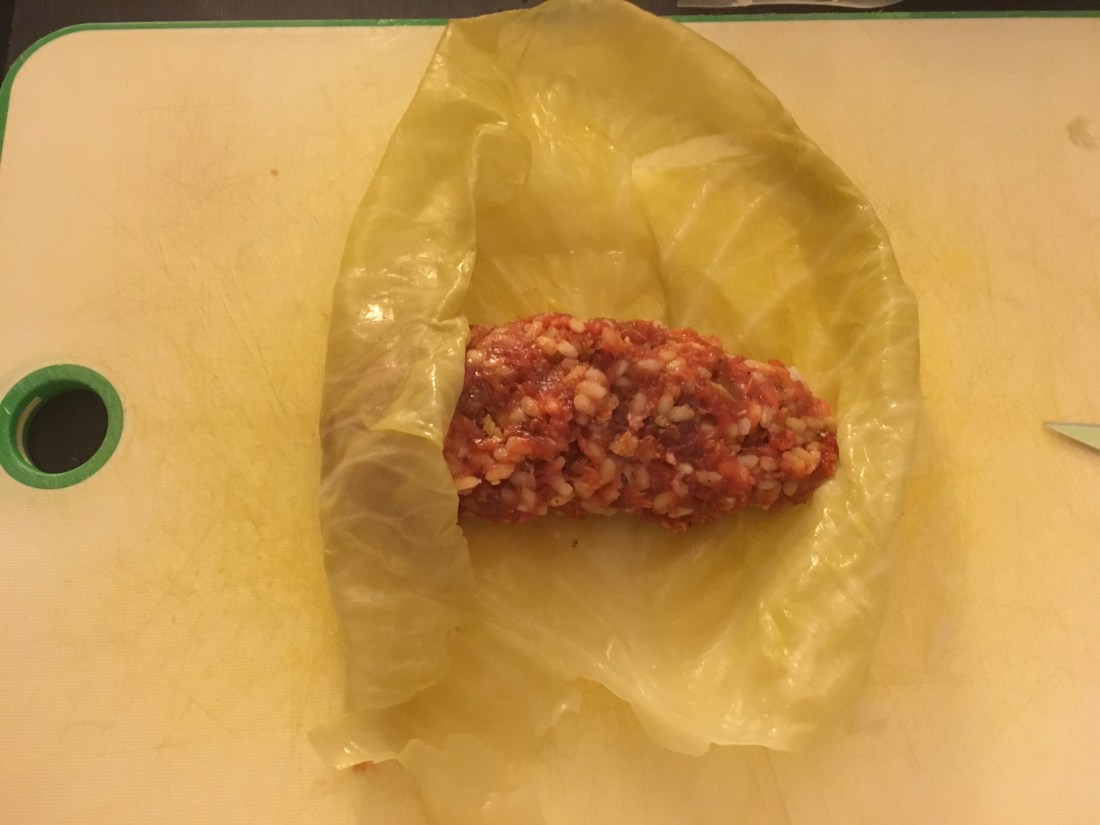 Sada počnite slagati sarme. Pažljivo s glavice zelja skinite 1 list i stavite ga na dasku za rezanje (ili drugu ravnu površinu) tako da kocen bude s donje strane. Zatim na donju polovicu lista stavite punu jušnu žlicu smjese i složite u obliku kao na slici. Sada sarmicu zamotajte točno slijedeći korake na slikama.