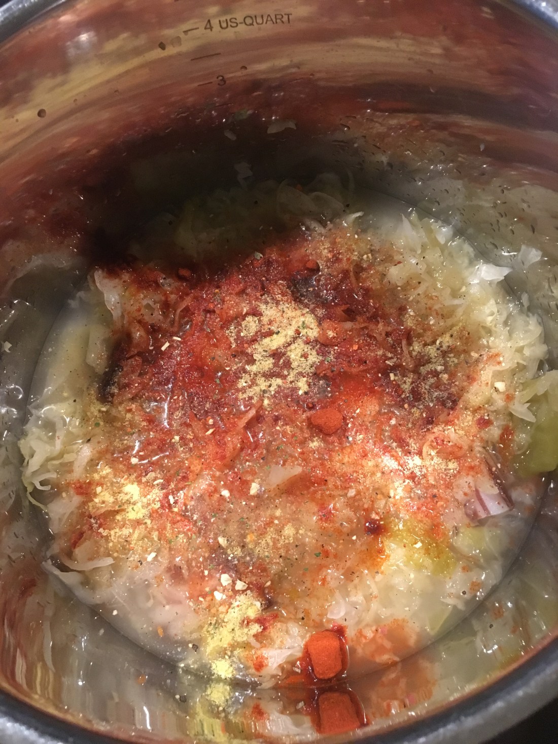 Sad uzmite najveći lonac koji imate (meni je na ovu količinu ispalo 18 velikih sarmi, kuhala sam u 2 lonca – jedan od 5L, drugi od 3L i bilo ne na knap). Na dno lonca stavite 3 prsta obične vode, zatim komade sušenog/dimljenog mesa/pancete i rezanog zelja da prekrije dno te pola žlice vegete i pola žlice crvene paprike. Svu tekućinu iz paketa zelja (i rezanog i glavice) nemojte baciti – dodajte ju u lonac.