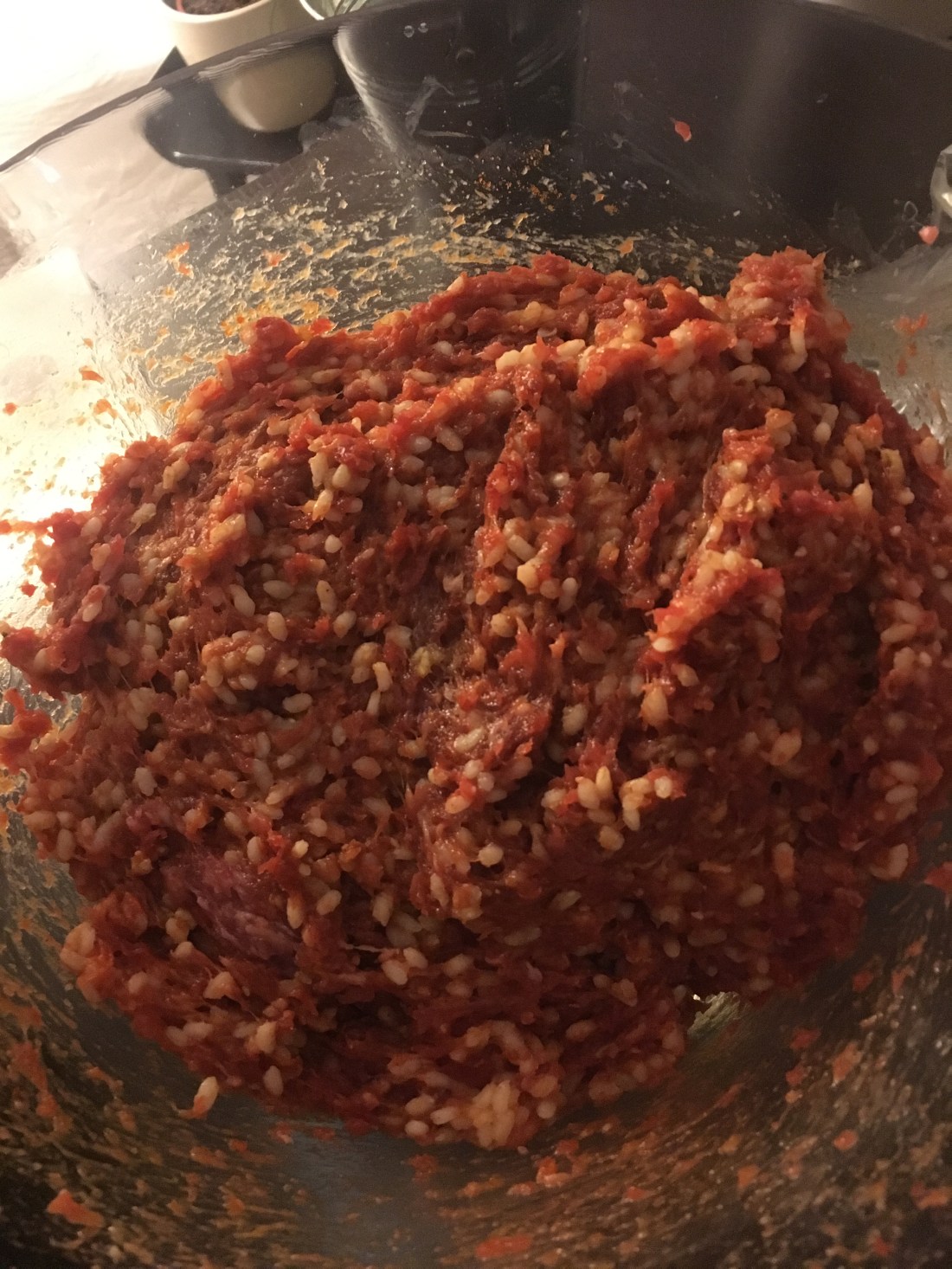 Dok se riža kuha, u meso dodajte 6 češnjeva češnjaka, najbolje narezanih s drobilicom za češnjak, 1 veliku jušnu žlicu Vegete, 1.5 jušnu žlicu slatke crvene paprike, papra po ukusu i jaje/jaja. Sve dobro promiješajte koristeći vilicu. Na kraju dodajte rižu koja se sad već skuhala, dobro ju umiješajte u smjesu i ostavite da stoji sa strane dok pripremate zelje i ostale sastojke.