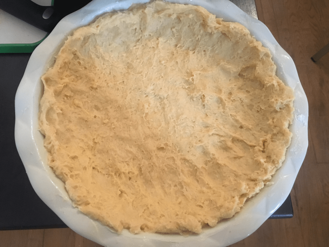 trik za tijesto da se za vrijeme prvog pečenaj rubovi ne “spuste”. Naime, tijesto ima puno putra koji zavrije dok se peče na 190 stupenjeva i onda rubovi spuznu na dno. Nije nikakva drama ako se to dogodi, imat ćete malo više tijesta na krajevima šnita i sve OK 🙂 Ali, postoji trik kako to možete spriječiti – na tijesto u stavite u obliku kruga izreza pek-papir tako da prekriva cijelu sredinu i rubove. Onda na pek papir stavite grah (svježe kupljeni, ne iz konzerve, i prethodno neobrađen, nenamakan i slično) toliko da visinom odgovara visini smjese i da “drži” rubove do pune visine. Tako stavite peči tijesto. Nakon 10 minuta kad tijesto izvadite maknite grah i pek-papir. Grah spremite za drugi put 🙂 a rubovi su sada sjajno očuvani!