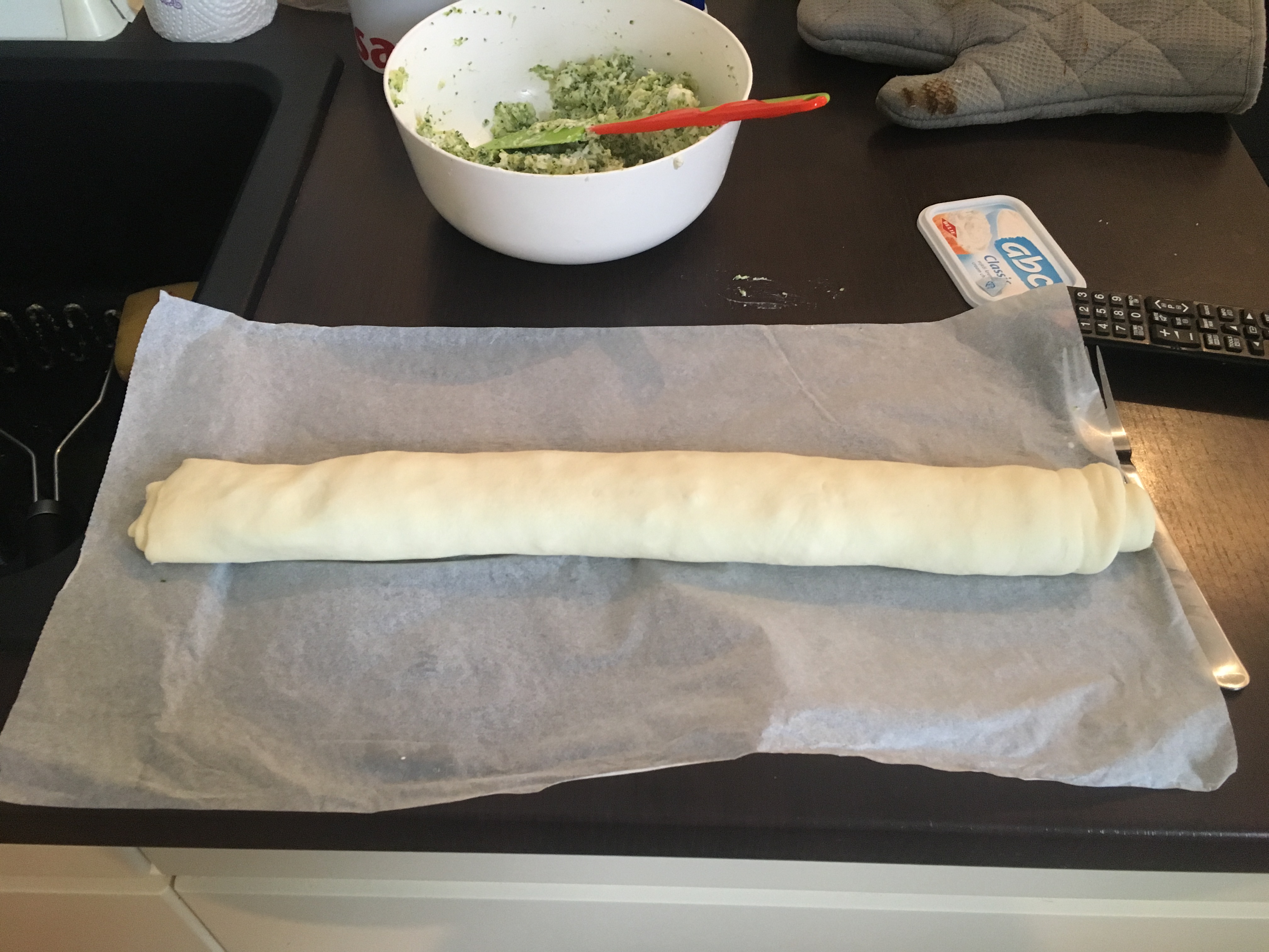 Otvorite plahtu lisnatog tijesta i po njemu razmažite smjesu. Zarolajte tijesto opet u roladu i rukama ga još malo popravite da bude ravnomjerno raspoređeno punjenje.