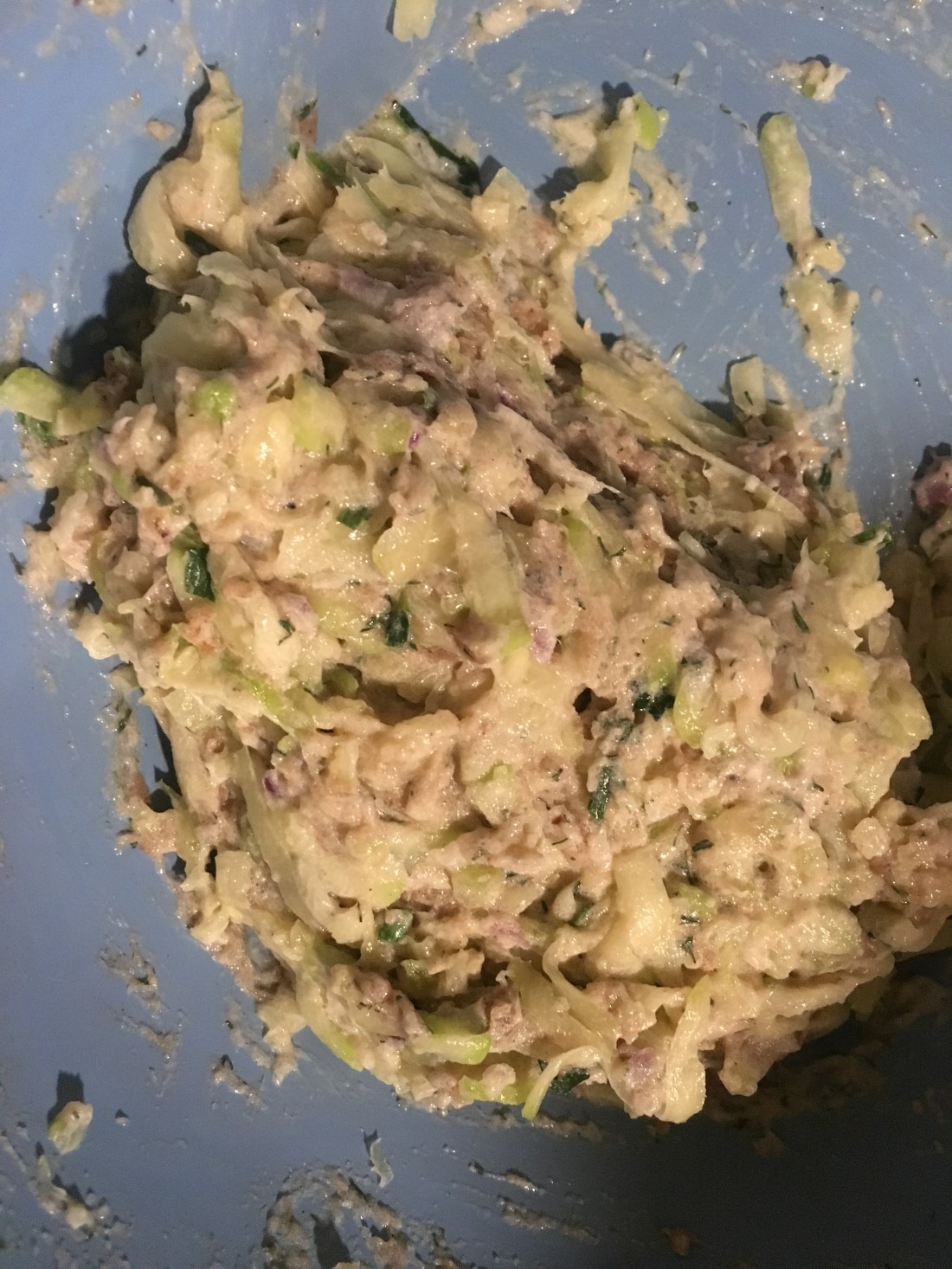 Nakon tikvica, smjesi dodajte žlicu kopra (može svježi, ali i sušeni nasjeckani ima sasvim dobru aromu), malu žličicu vlasca (ista stvar kao i s koprom) i obavezno svježi peršin. Ako nemate svježi, radije nemojte staviti ništa (sušeni). Sve promiješajte i na kraju dodajte brašno.