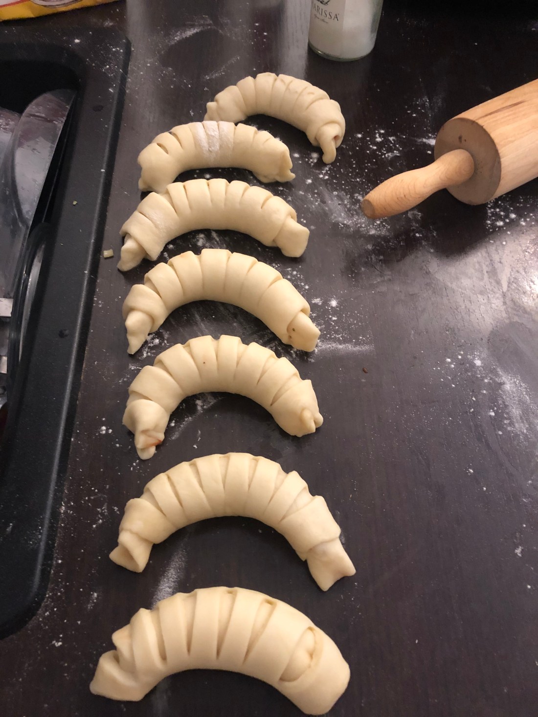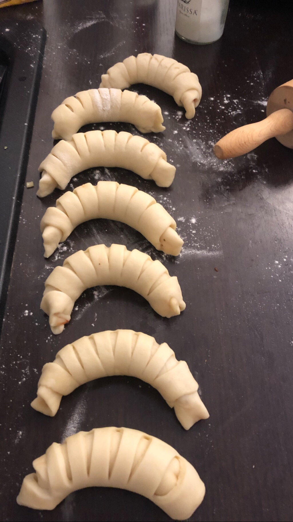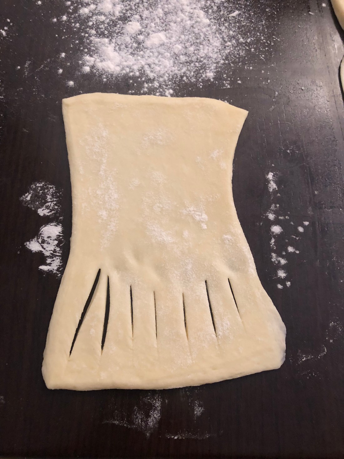 Uzmite jedan kvadratic, jos ga malo razvaljajte i razrezite nozem kraj tijesta kao na slici (ne skroz do ruba!). Sad vrh koji nije razrezan mozete puniti ako ste se odlucili na tu verziju. Primite tijesto za lijevi i desni gornji vrh, preklopite preko punjenja/prema sebi i frčite dok ne potrošite cijeli kvadratić. Voila! 🙂 kad ste gotovi, mozete jos malo krajeve zakriviti prema sebi pa budu polukružne.