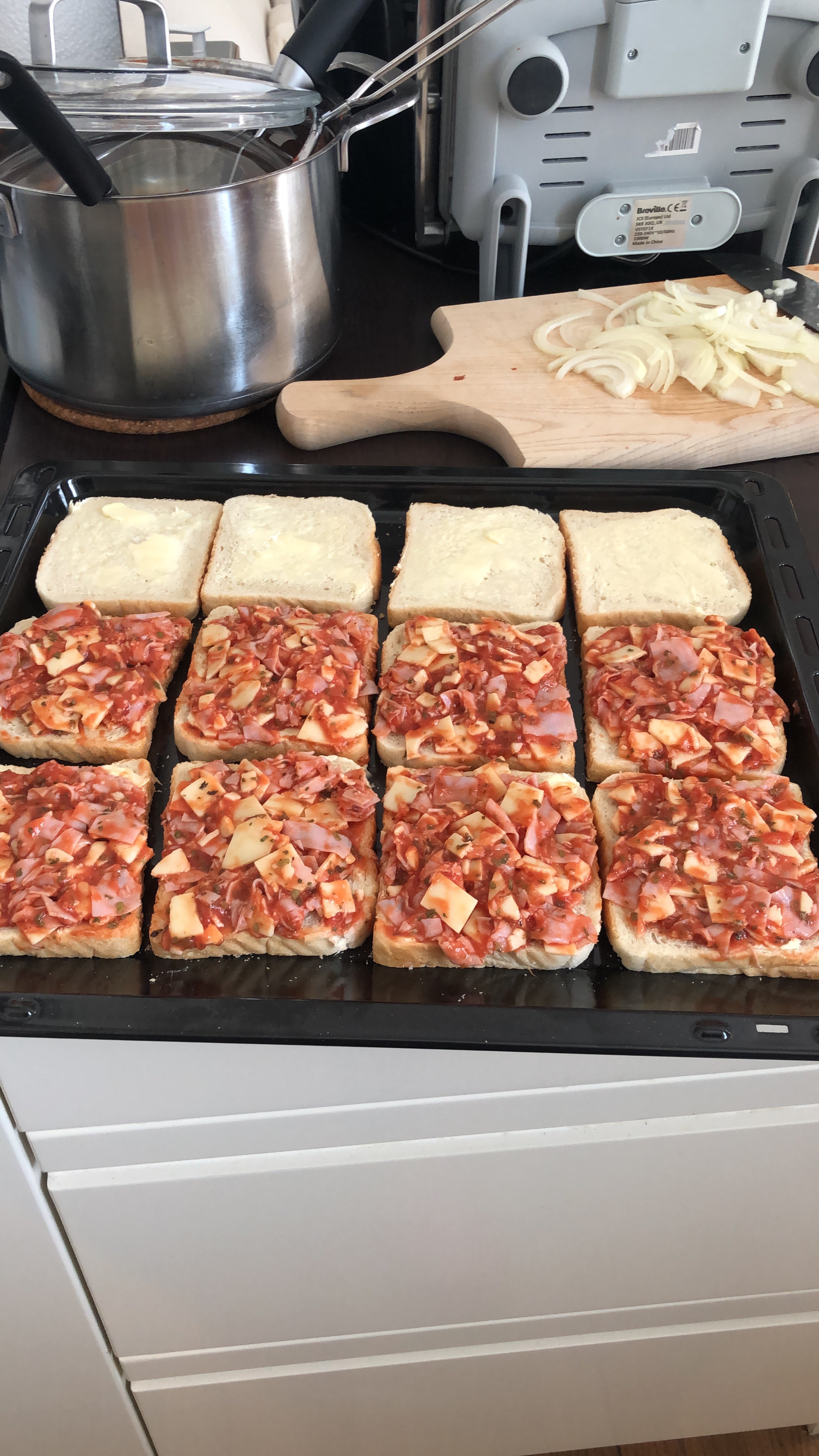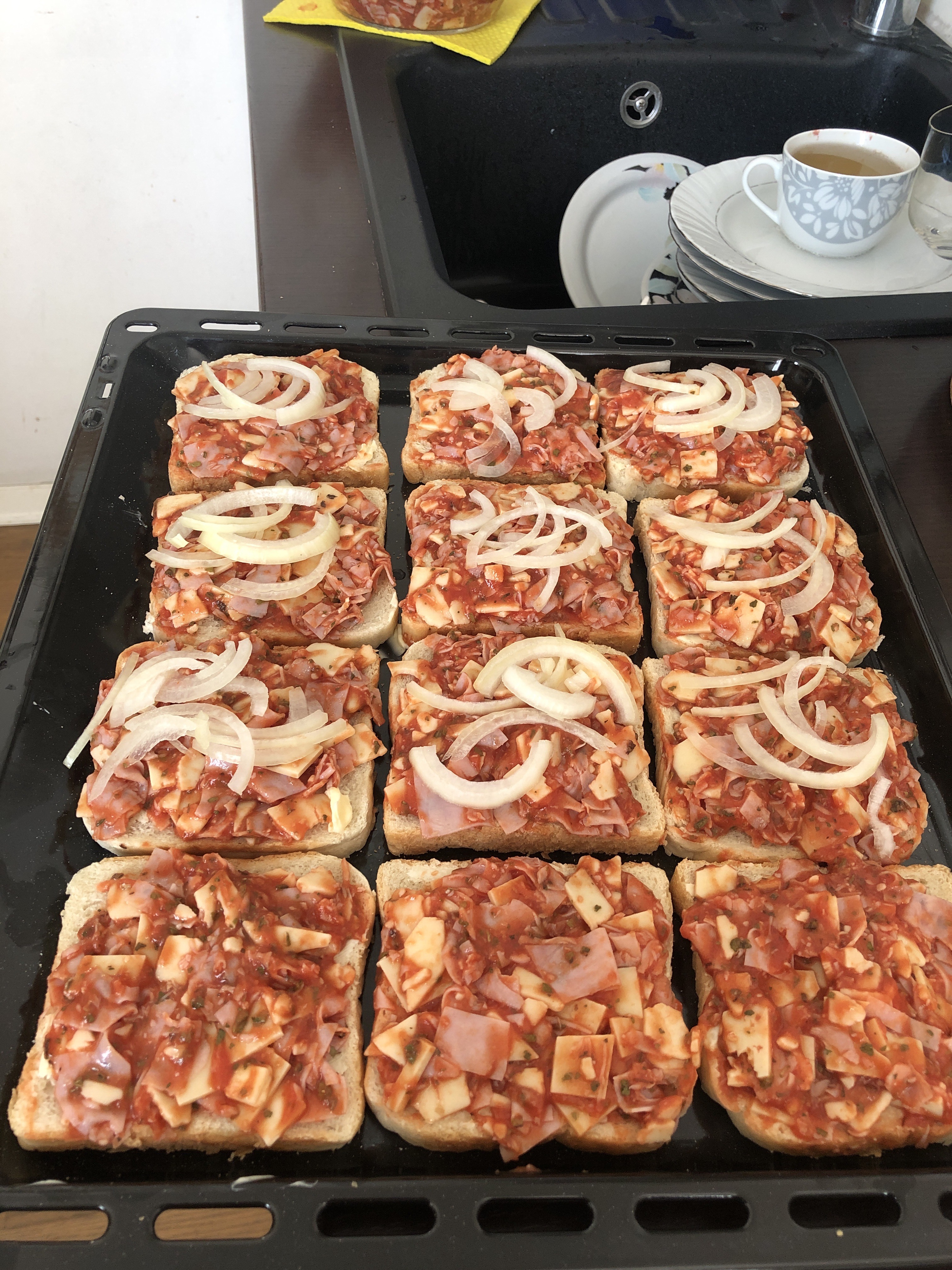 Pećnicu upalite na 250. Na pleh od pećnice poredajte tost koliko vam stane. Tost lagano premažite putrom. I sad polako svaki tost uzmite i ruku i na njega stavite jednu vrhom punu jušnu žlicu smjese i lijepo ju pogurajte do rubova i izravnajte.